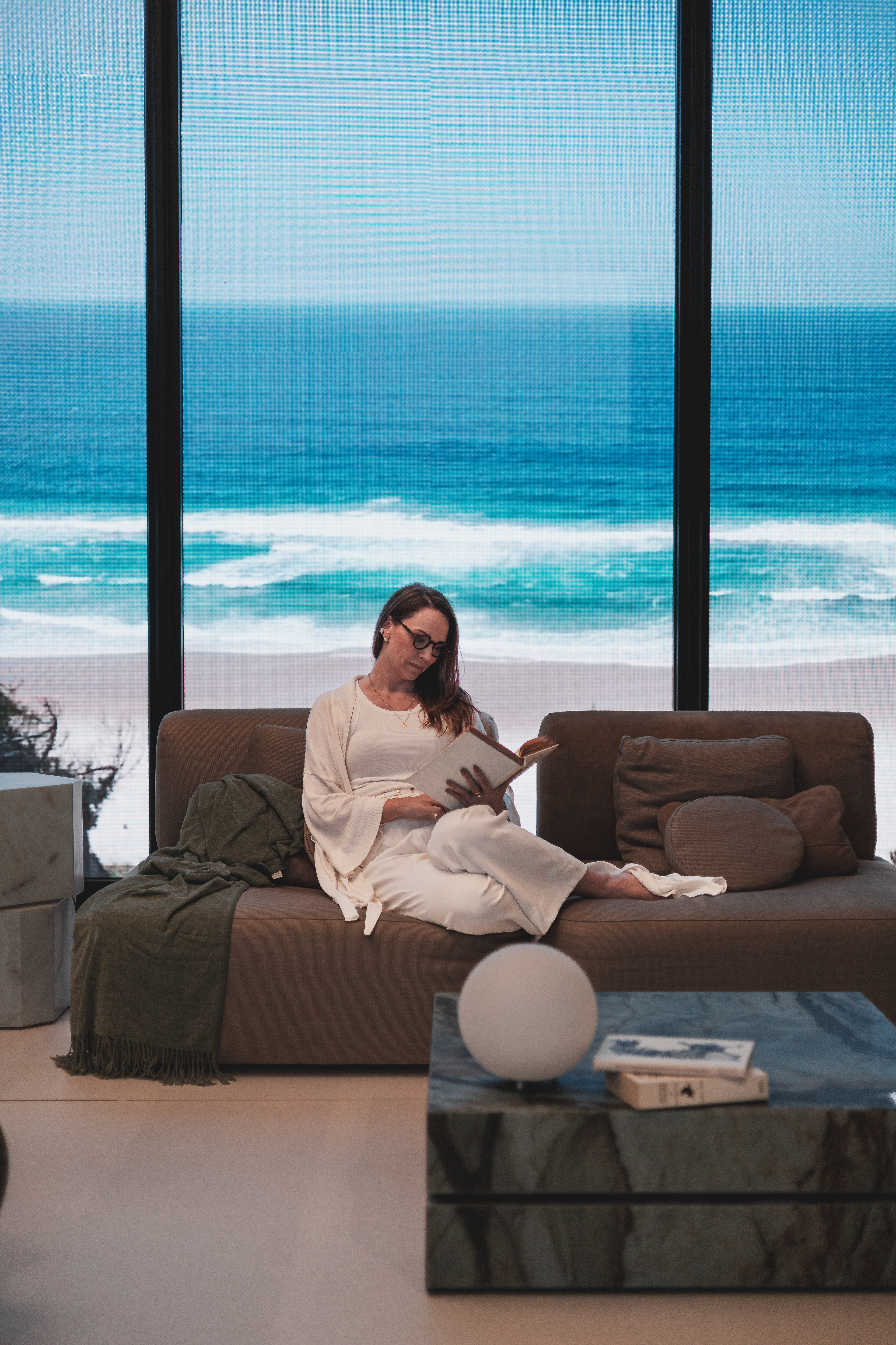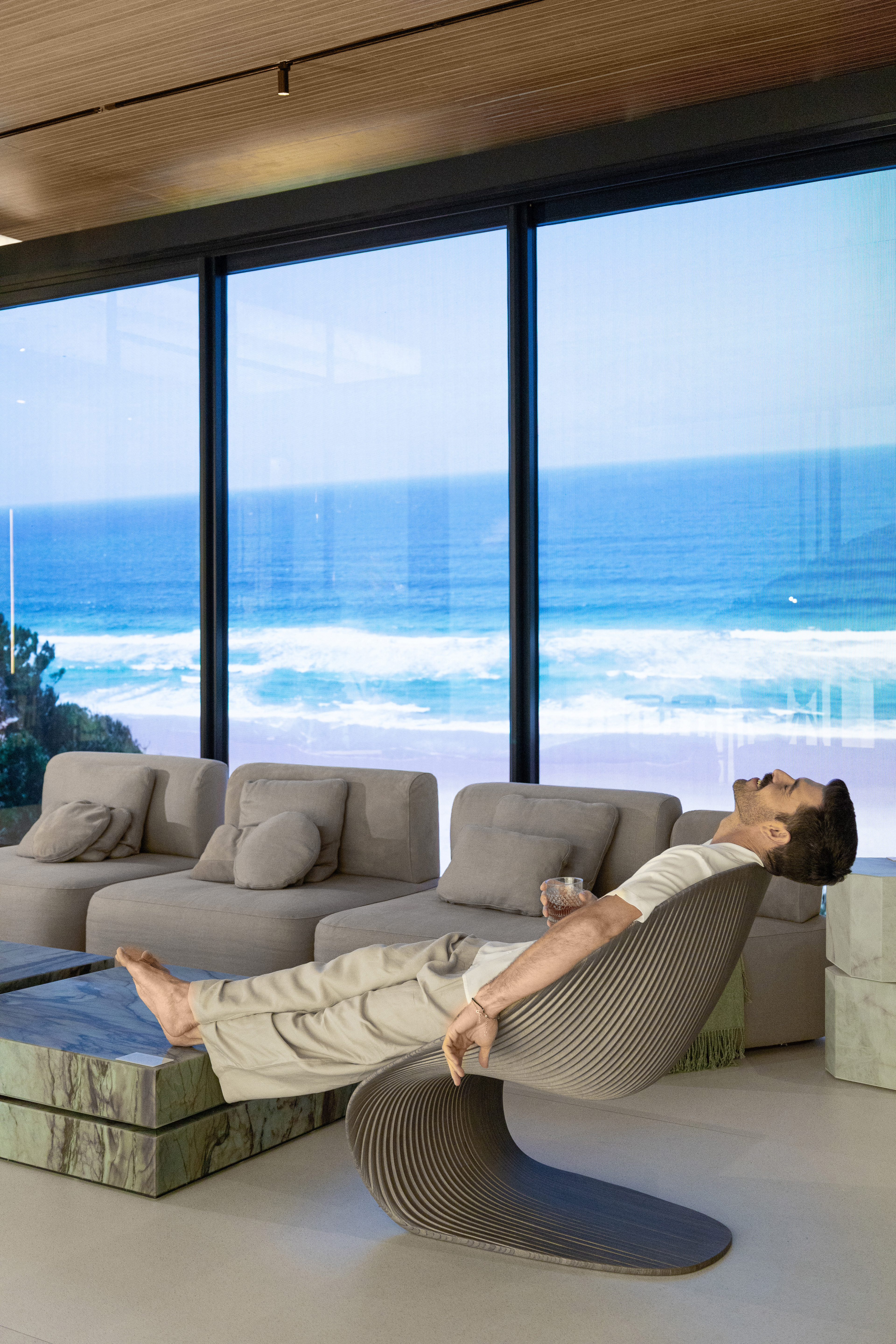 "Ali fora, o sol vibra em um intenso calor e a todo momento tenho a vista para o mar, Aqui dentro, refrescante e sereno consigo relaxar em meu lar."